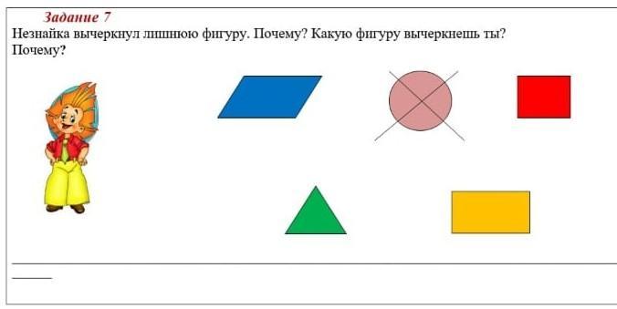 Незнайка вычеркнул лишнюю фигуру. Почему? Какую фигуру вычеркнешь ты?