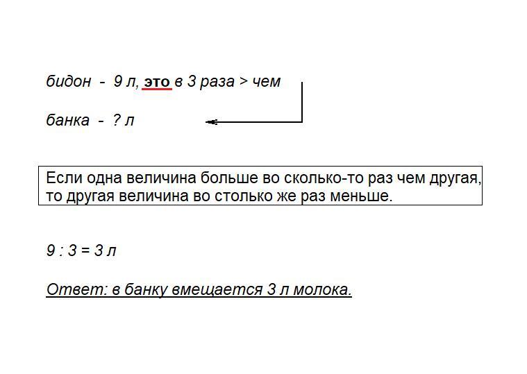 Реши задачу в бидон помещается 9 л молока Это три раза больше чем в банке Сколько литров молока в мешается банку
