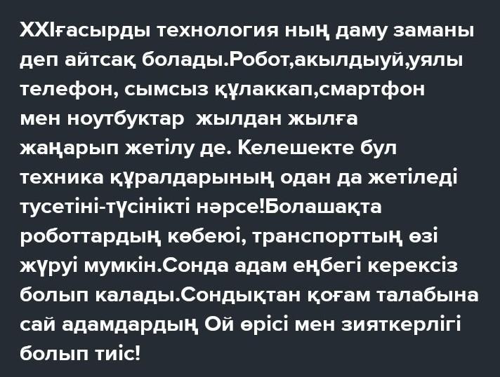 Сөйлем соңына тиісті тыныс белгісін қойып, келесі сөйлемді бас әріппен жазыңдар. ХХІ ғасырды «Технологиялардың даму заманы» деп айтсақ болады робот, ақылды үй, ұялы телефон, сымсыз құлаққап, смартфон мен ноутбуктар жылдан жылға жаңарып, жетілуде келешекте бұл техника құралдарының одан да жетіле түсетіні – түсінікті нәрсе болашақта роботтардың көбеюі, транспорттың өзі жүруі мүмкін сонда адам еңбегі керексіз болып қалады сондықтан қоғам талабына сай адамдардың ой-өресі мен зияткерлігі болуы тиіс.