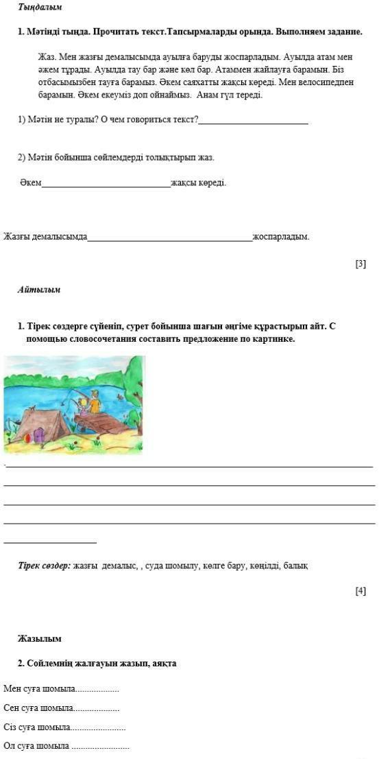 1.Мен жазғы демалысымда әкеммен ауылға бардым. Біз ауылда көлге бардық, суда шомылдық, балық ауладық. Менің ауылдағы демалысым осылайша көңілді өтті.