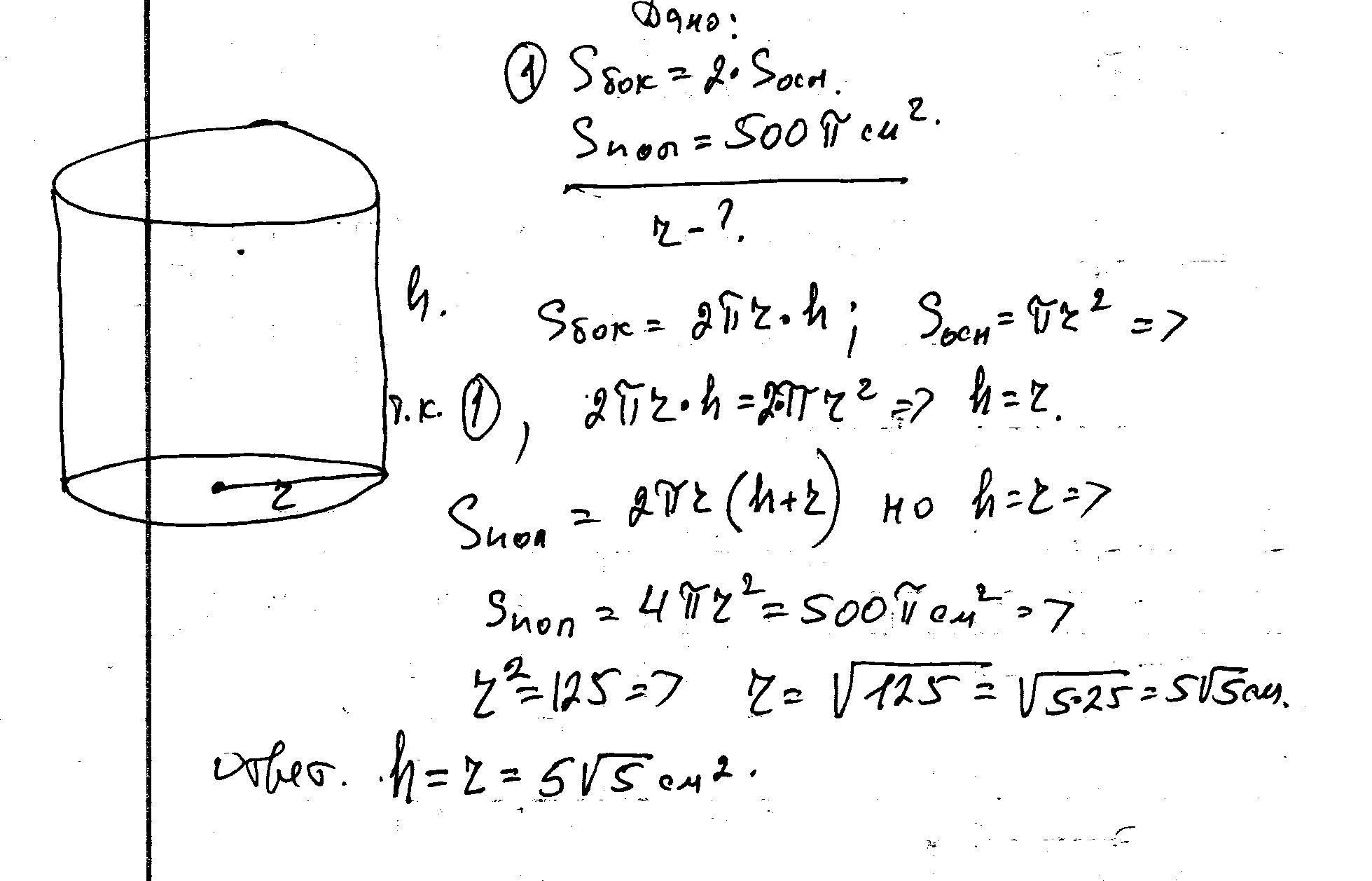 Площадь боковой поверхности цилиндра вдвое больше площади основания, а площадь полной поверхности 500