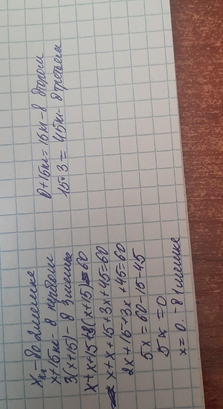 В трех мешках 60 кг сахара. В первом на 15кг больше, чем во втором, а в третьем втрое больше, чем во второй. Сколько килограмм сахара в каждом мешке?