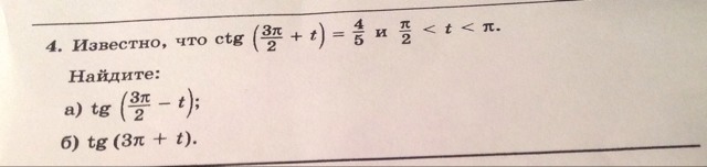 ctg(3pi/2 + t) = -tg t = 4/5, значит tg t = -4/5. Поскольку pi/2 < t < pi, то
