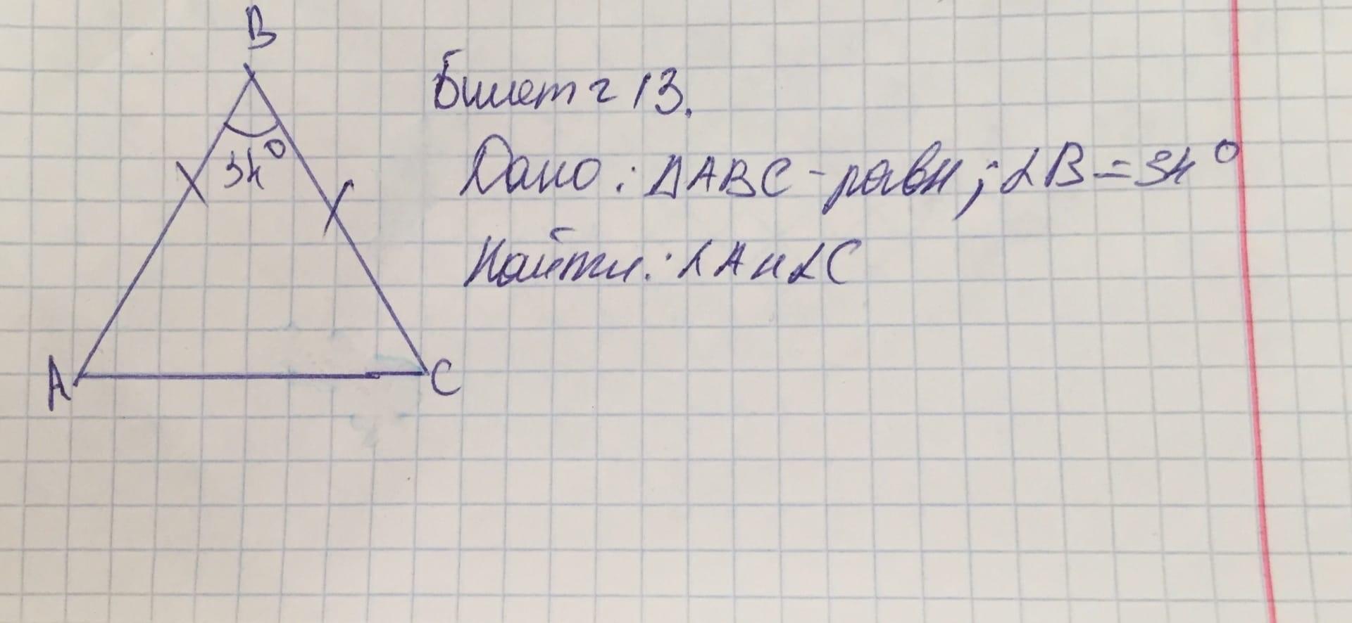 Тк треугольник равнобедренный, значит угол А = углу С = (180-34)÷2=73