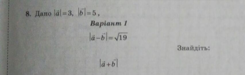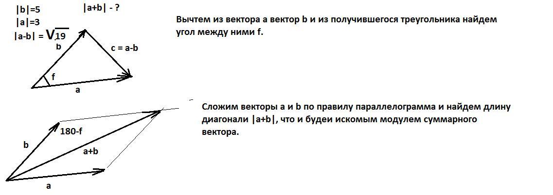 |a+b|² = |a|²+|b|²-2|a|*|b|*cos(180-f) = 3²+5² +2*3*5*0,5 = 49