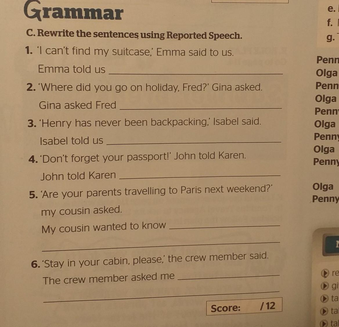 Ответ:1) Emma told us that she couldn't find her suitcase.2) Gina asked Fred where he went on holiday. 3) Isabel told us that Henry hadn't never been backpacking. 4) John told Karen not to forget her passport. 5) My cousin wanted to know would my parents travel to Paris the next week. 6) The crew member asked me to stay in my cabin.