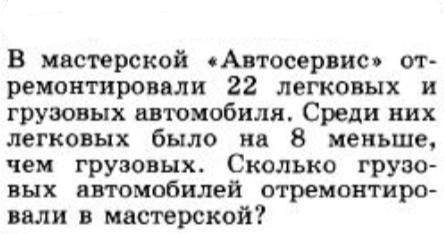 Перша задача: 1. 22-8-14 2. 14:2-7 3. 7+8-15 (грузових) 4. 22-15- 7( легкових)