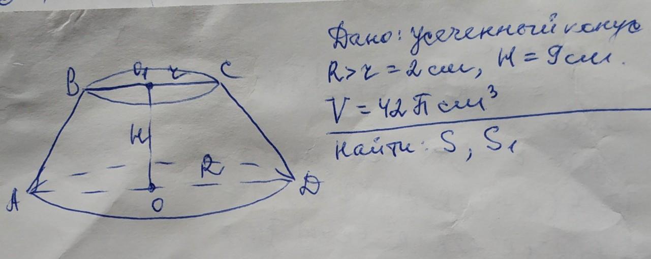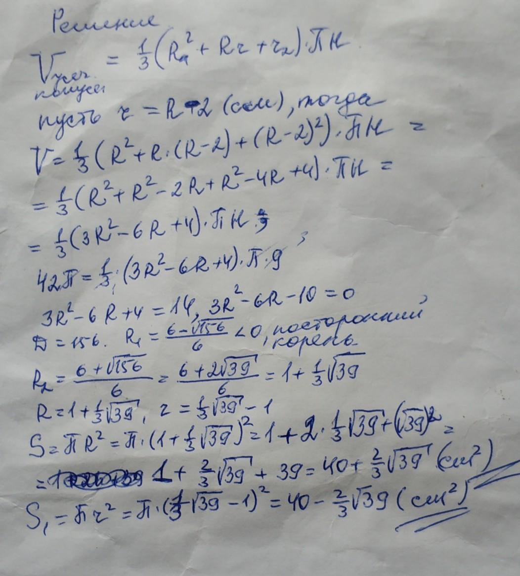 В усечённом конусе разность радиусов оснований равна 2 см, высота равна 9 см и его объём равен 42π см³. Определите площади оснований.