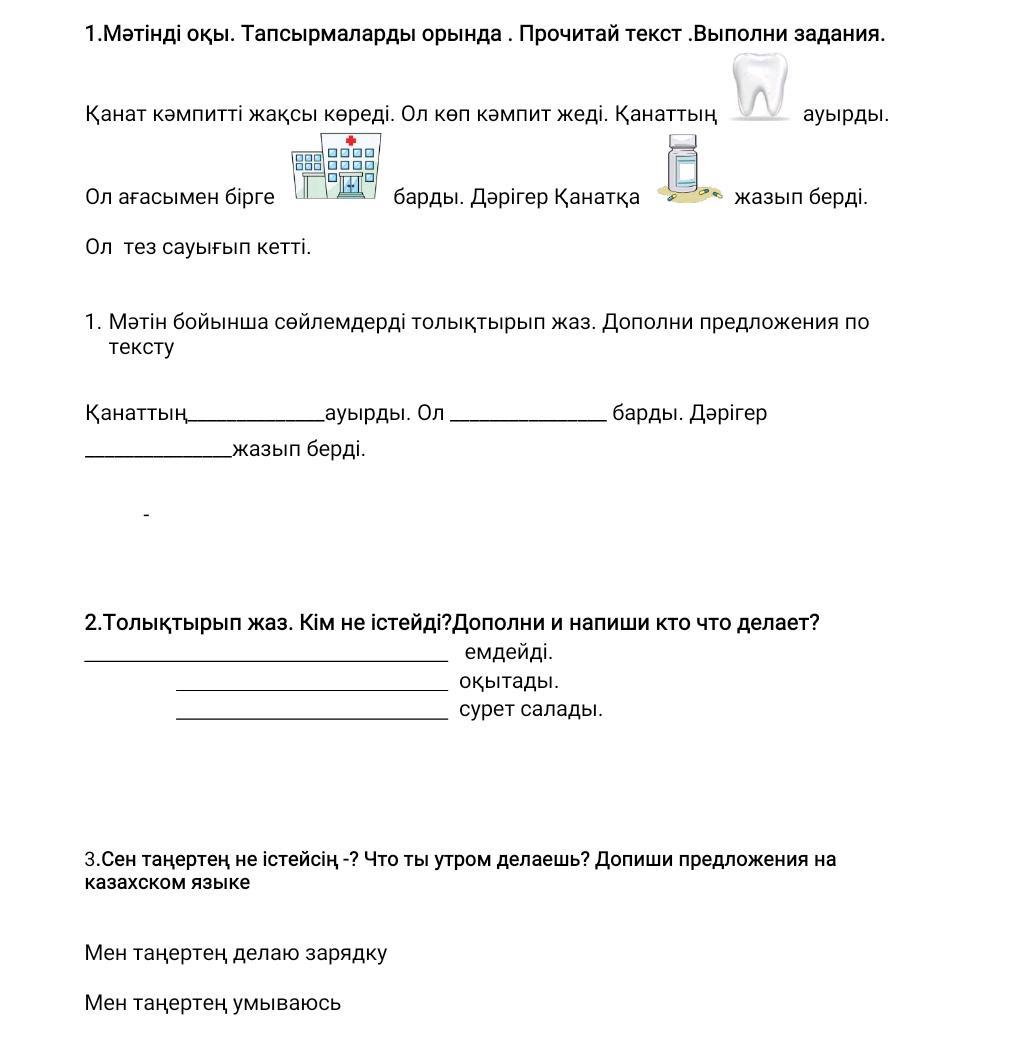 Қанаттын тісі ауырды. Ол дәрігерге барды. Дәрігер дәрі жазып берді.