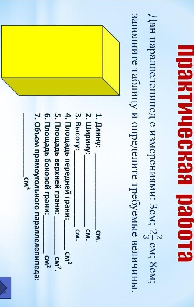 7. V=abc=Sвг×c=8см²×8 см=64 см³