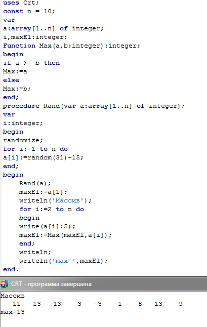 Составить программу нахождения наибольшего элемента в линейном массиве, используя вспомогательные процедуры нахождения наибольшего из двух чисел и создания массива случайных чисел.