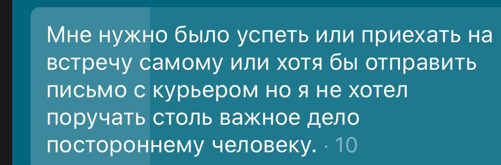 Мне нужно было успеть или приехать на встречу самому,или хотя бы отправить письмо с курьером,но я не хотел поручать столь важное дело постороннему человеку.