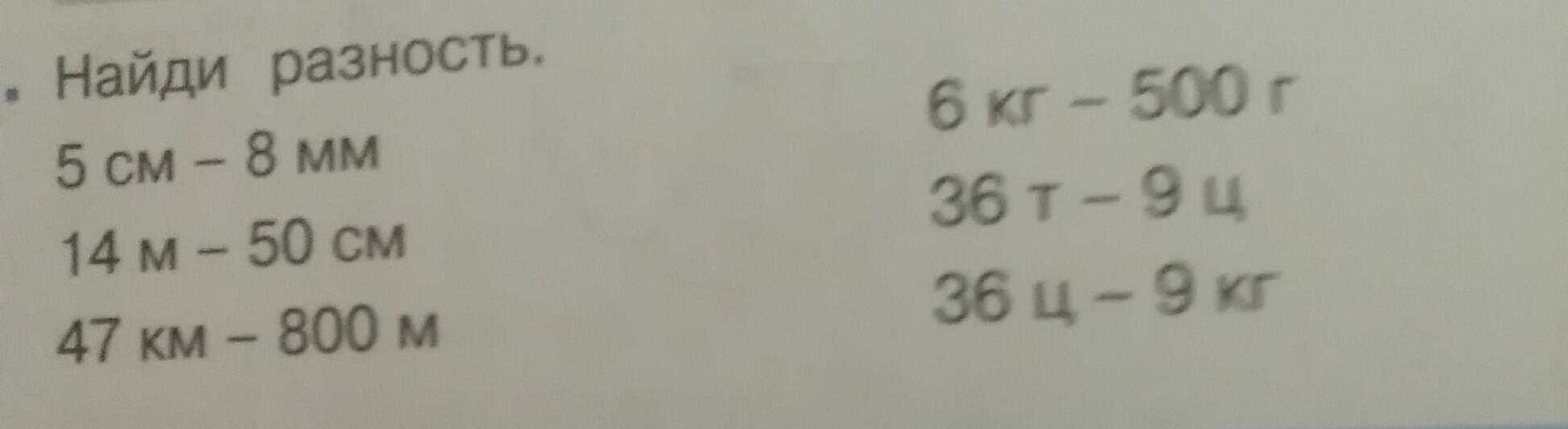 Ответ:5 cм-8мм=4см 2мм 14м-50см=13м 50см 47км-800м=46 км 200м
