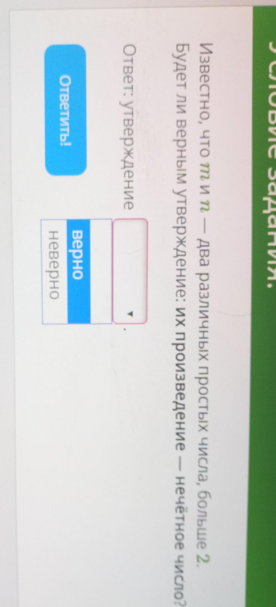 известно что M и N два различных простых числа больше 2 будет ли верным утверждение их произведения нечётное число ответ утверждение верно или неверно