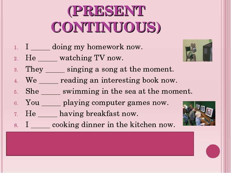 1.I am swimming now; 6.My grandma is waiting for me in the park now.