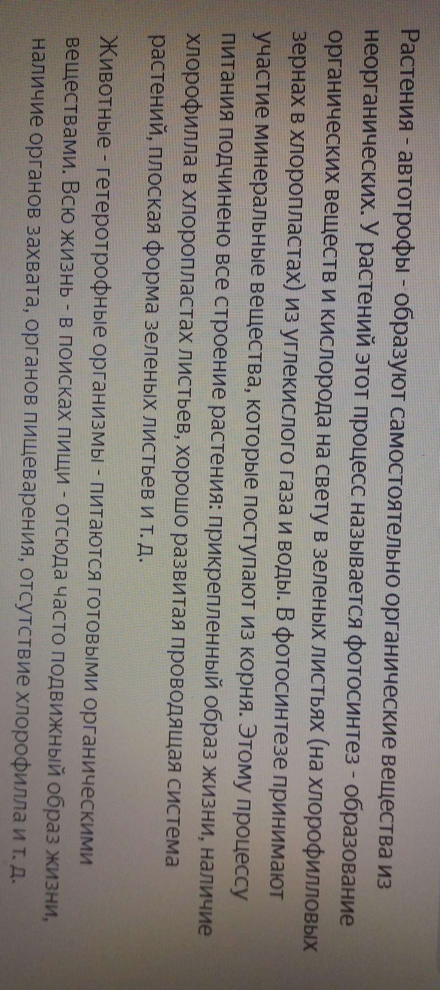 1.Сравните обмен веществ у растений т животных. Укажите черты сходства и различия.
