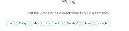 Мы видим вопросительный знак, значит это вопрос => первое слово - модальный глагол may, затем подлежащее I, затем сказуемое book (бронировать), затем прямое дополнение a single (одноместный номер), затем обстоятельство времени from friday to monday (с пятницы до понедельника)