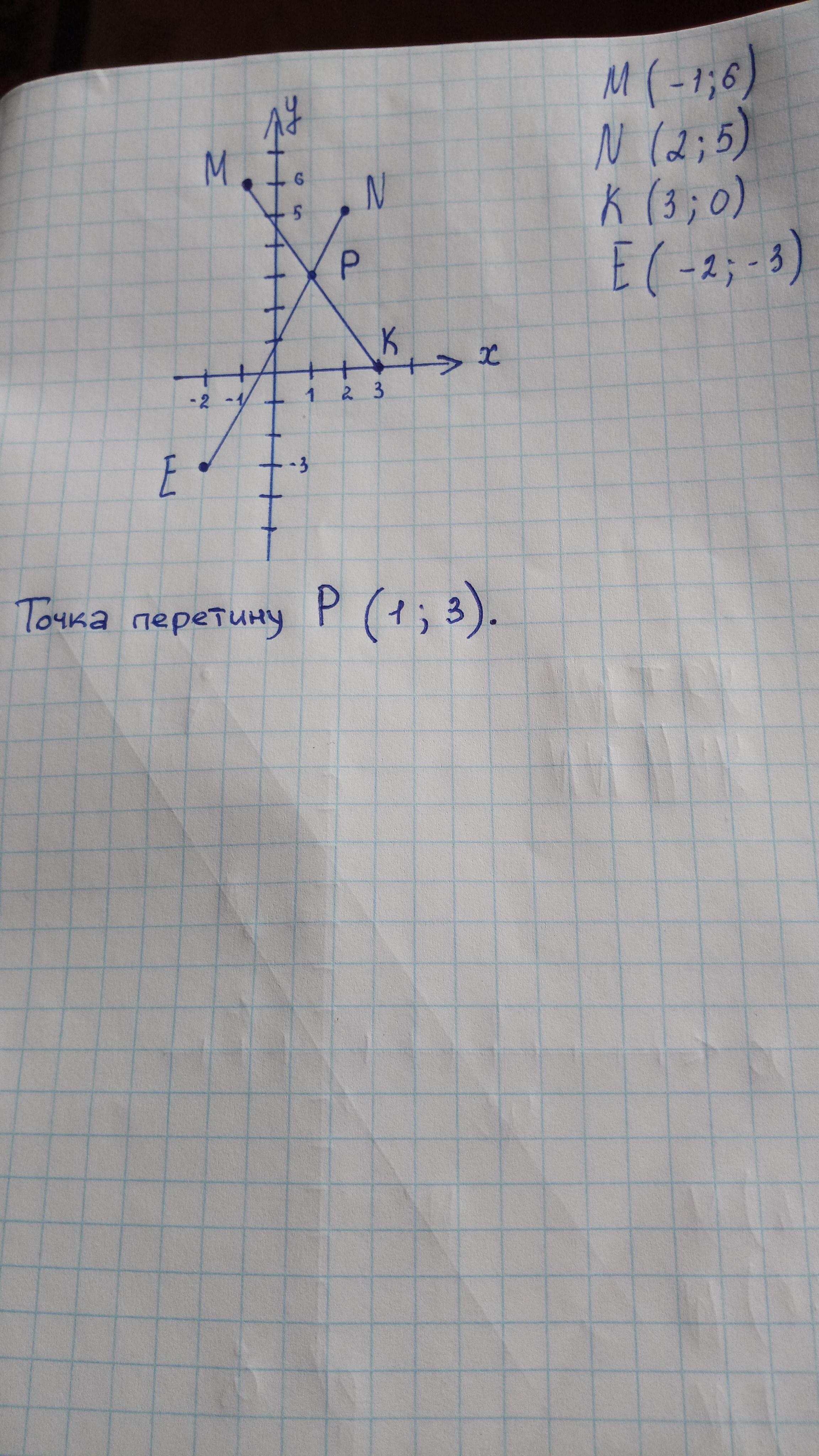 Позначте на координатній площині точки М(-1;6); N(2;5); К(3;0); Е(-2;-3) Проведіть відрізки МК і NE, знайдіть координати точки перетину цих відрізків