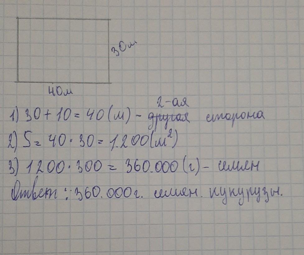 Одна сторона земельного участка прямоугольной формы равна 30 м, и она на 10 м короче другой. Участок засеяли кукурузой. Сколько нужно семян, если на 1м 2 нужно 300 г?