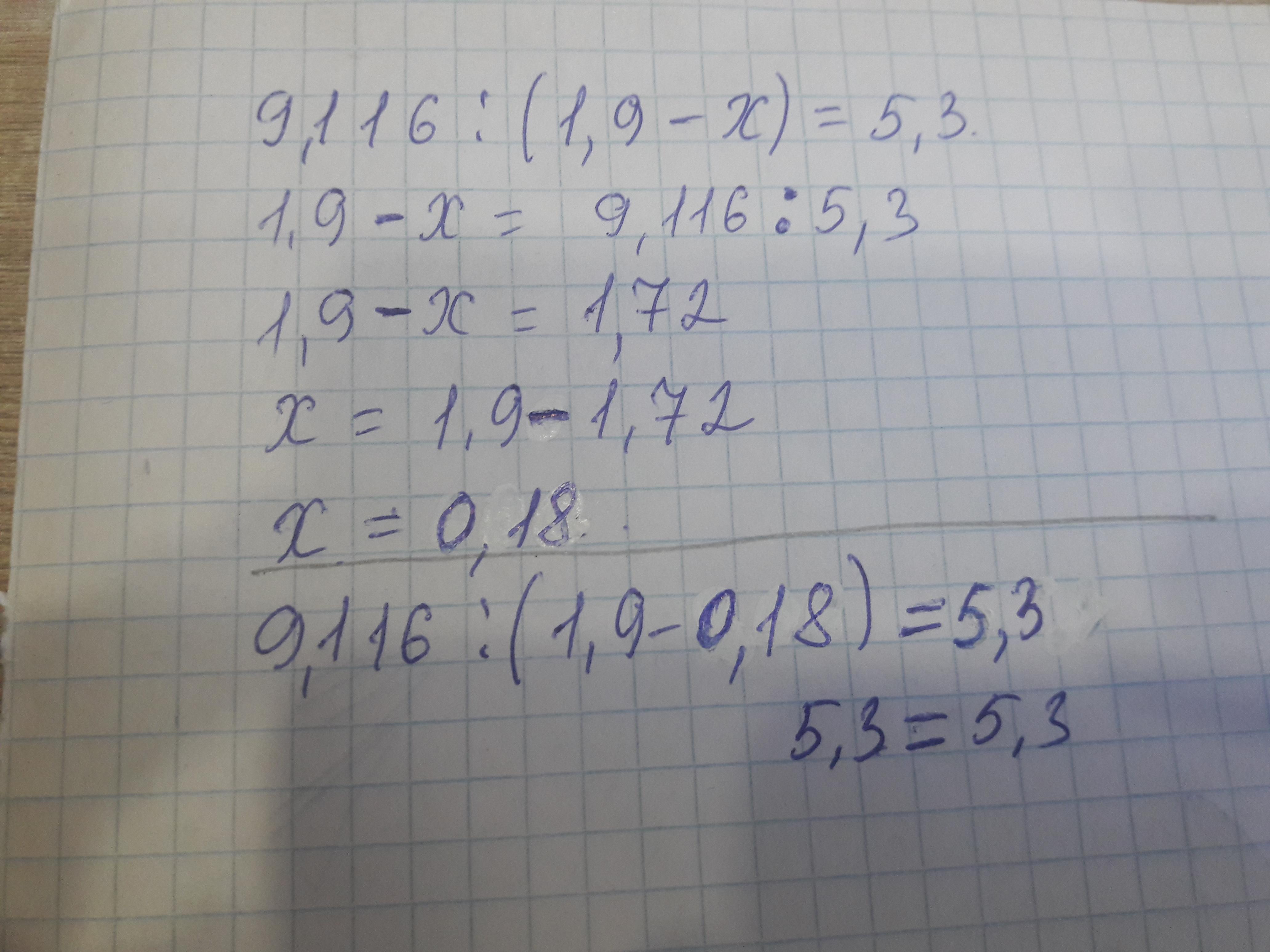 Реши уравнение с проверкой 9,116: (1,9-х)= 5,3