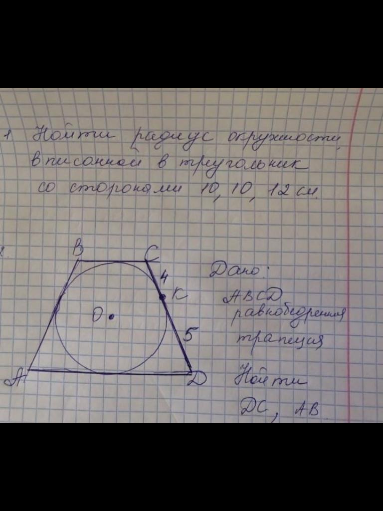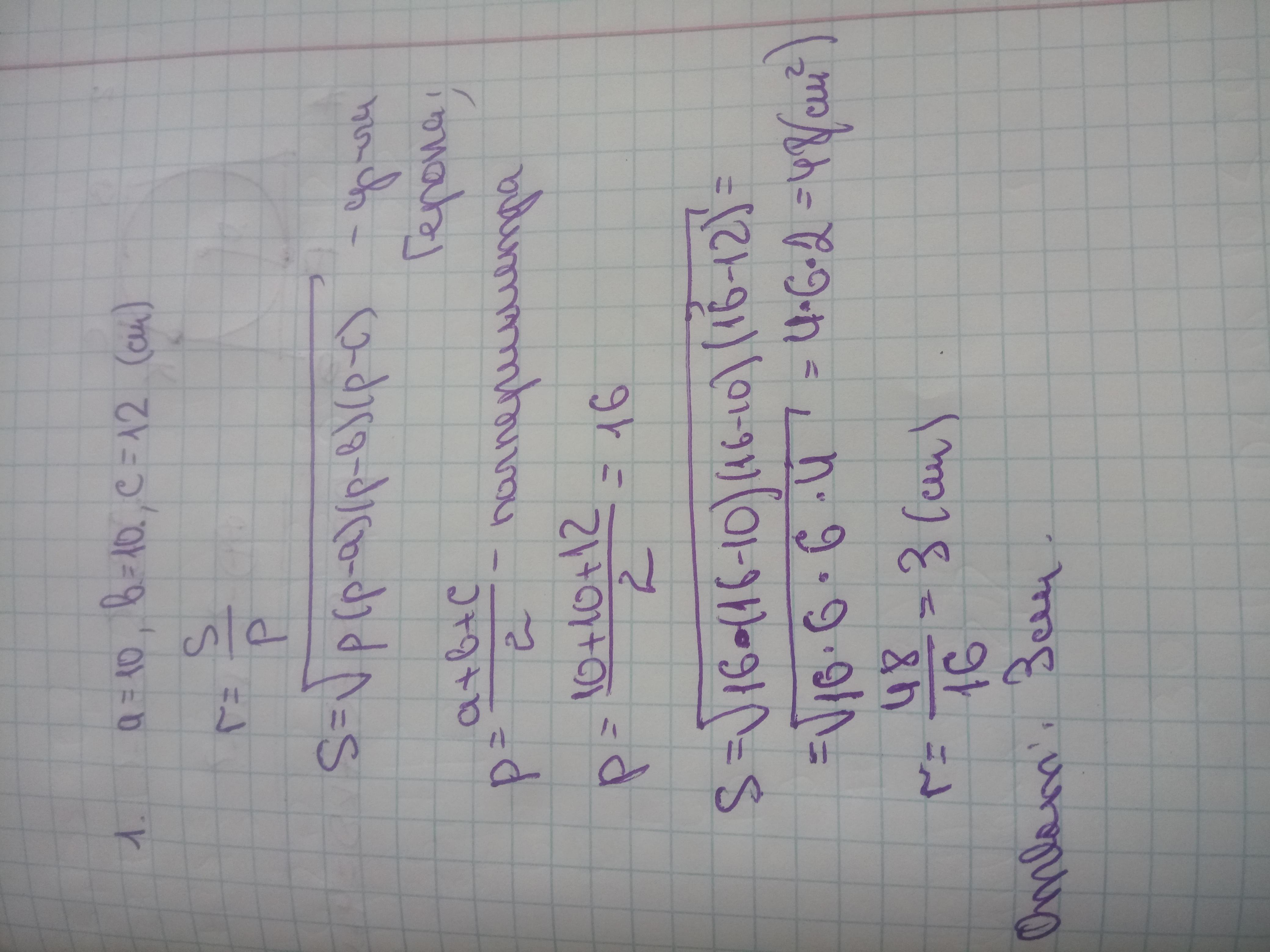 Помогите пожалуйста!Найти радиус окружности вписанной в треугольник со сторонами 10,10 и 12 см.
