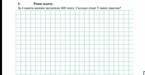 за 4 пакета Молока заплатили 400 тенге .сколько стоит 5 таких пакетов?.Это срочно