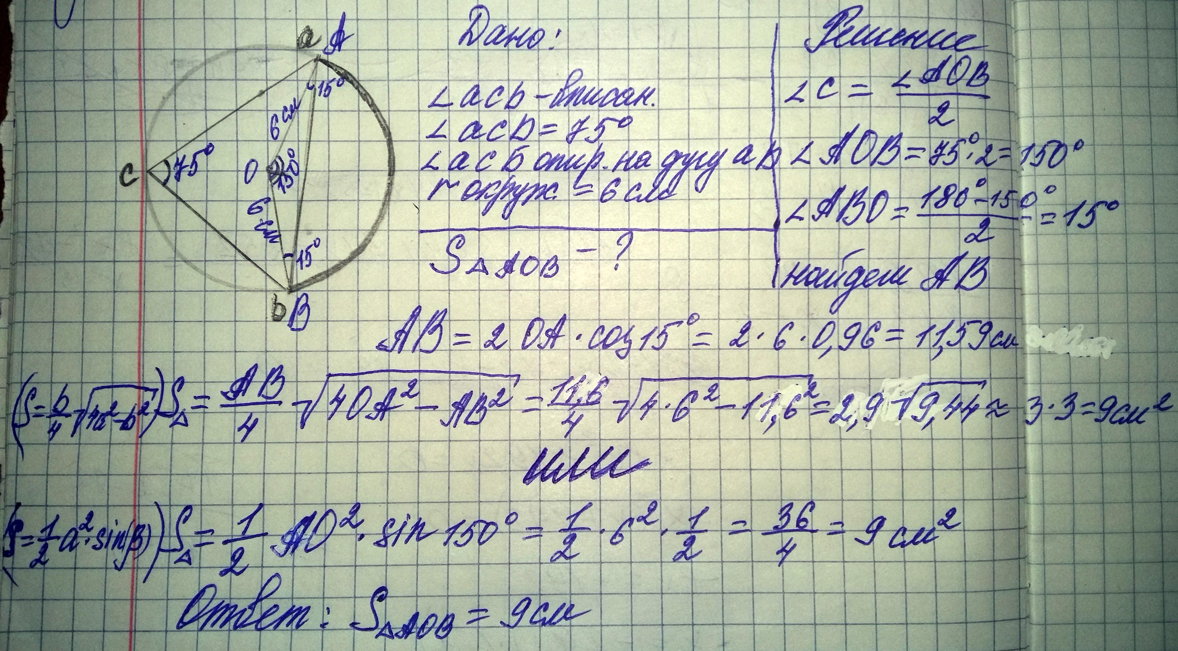 вписанный в окружность угол abc, равный 75, опирается на дугу ab. радиус окружности равен 6 см. найдите площадь треугольникаAOB.