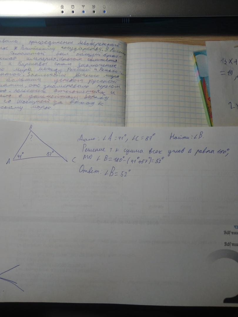 Дано: ΔАВС, ∠А=41°, ∠С=87°. Найти ∠В