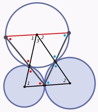 Три окружности касаются друг друга внеш ним образом. Две прямые, проходящие через точки их касания, вторично пере секают одну из этих окружностей в двух точках. Докажите, что эти две точки – диаметрально противоположны.