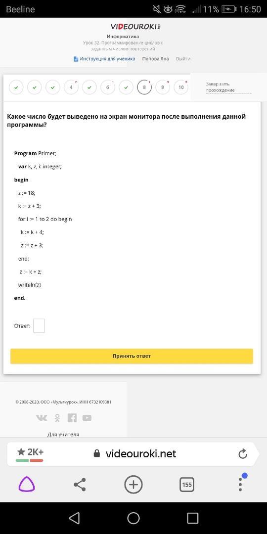 какое число будет выведенно на экран монитора после выполнения данной программы