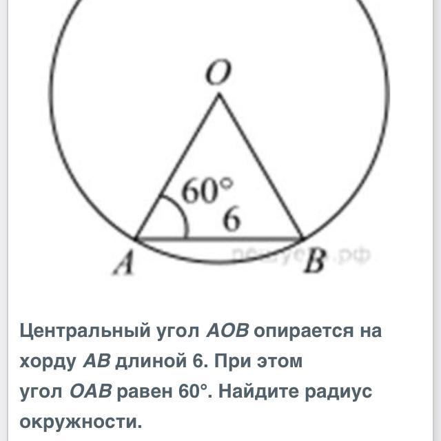 Т.к один из углов треугольника равен 60, а сумма всех углов треугольника равна 180, отсюда следует что все углы треугольника равны 60 и этот треугольник равносторонний, значит у него все стороны равны, и следовательно AB = OB(радиус)= 6