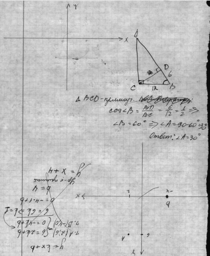 В прямоугольном треугольнике ABC с прямым углом C проведена высота CD. Найдите величину угла A, если DB = 6, а BC =12.