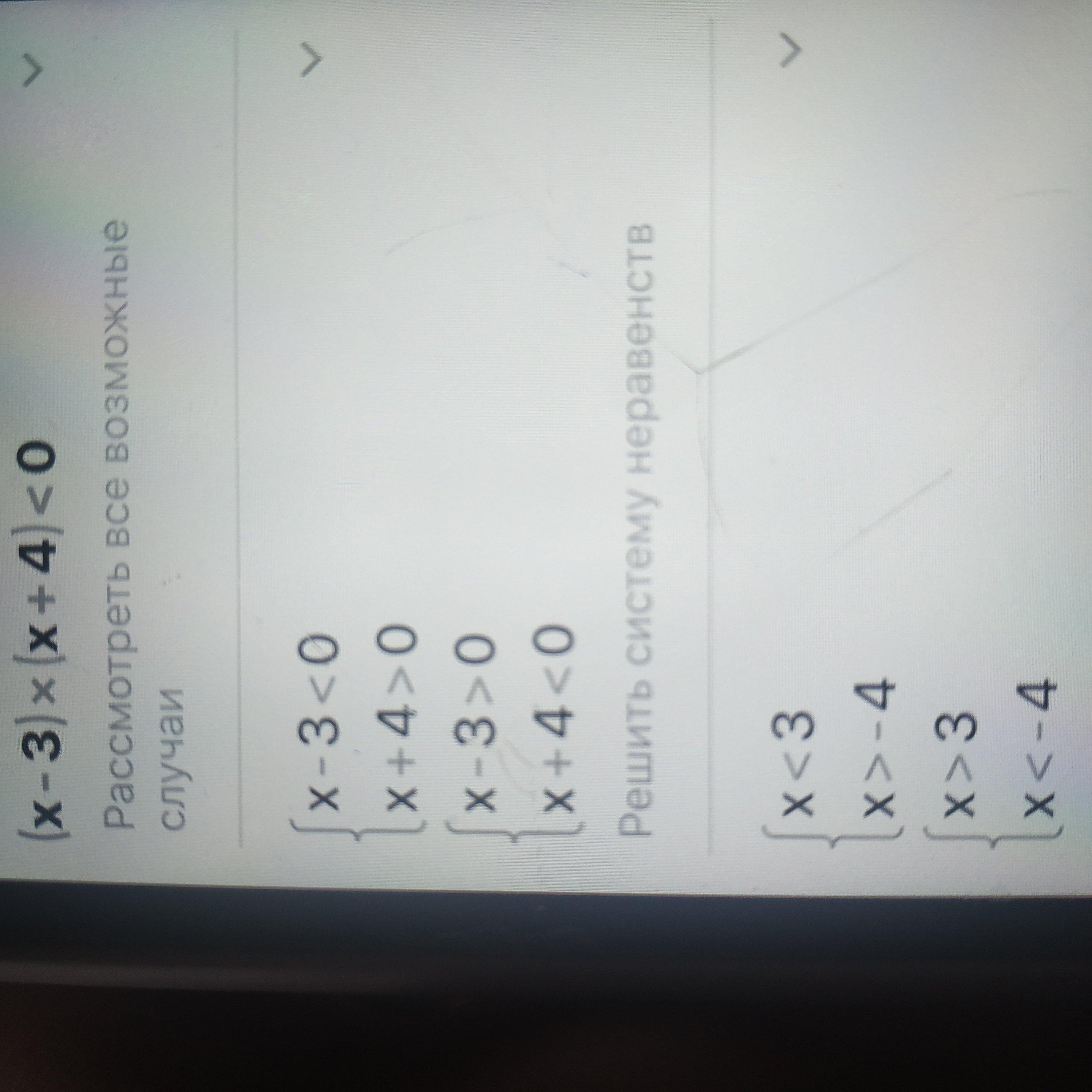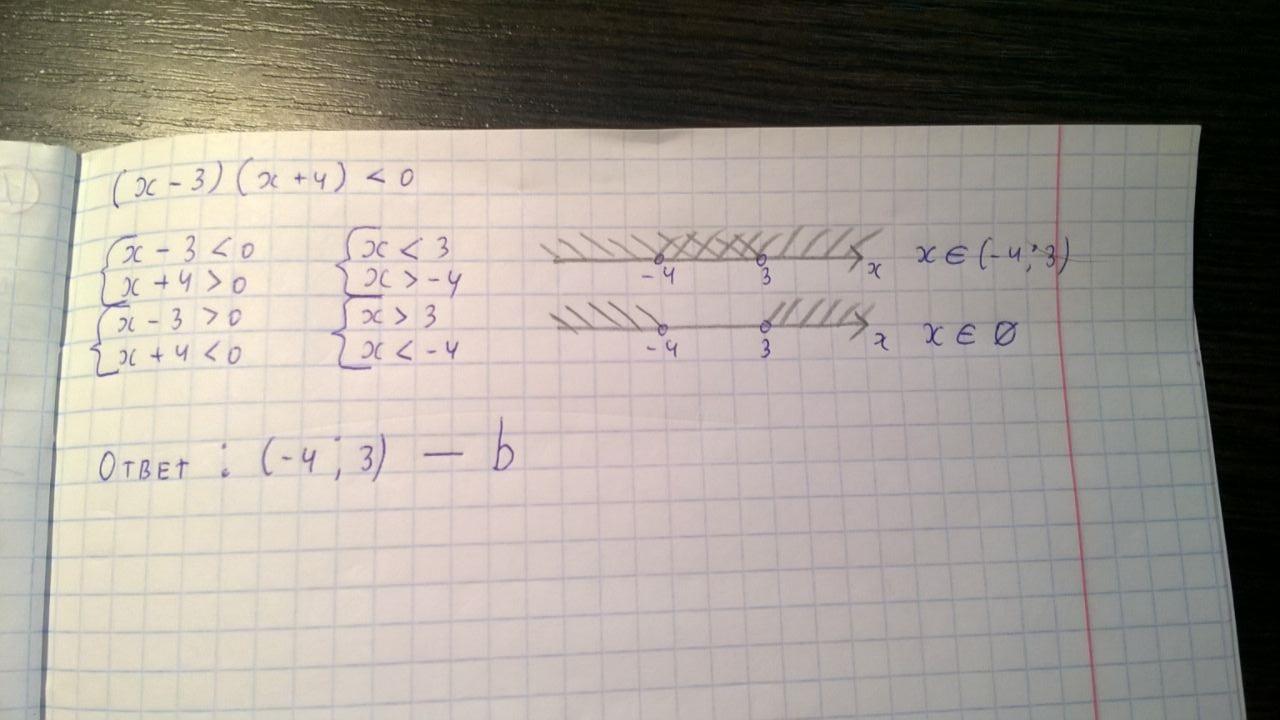 Объяснение: Возможны два случая, когда при а * b (в нашем случае а = (х - 3), b = (x + 4) ) может быть < 0: когда в первой системе a < 0, b > 0 и во второй a > 0, b < 0 (это вы можете увидеть на фото прямо под неравенством. Переносим числа, получаем: