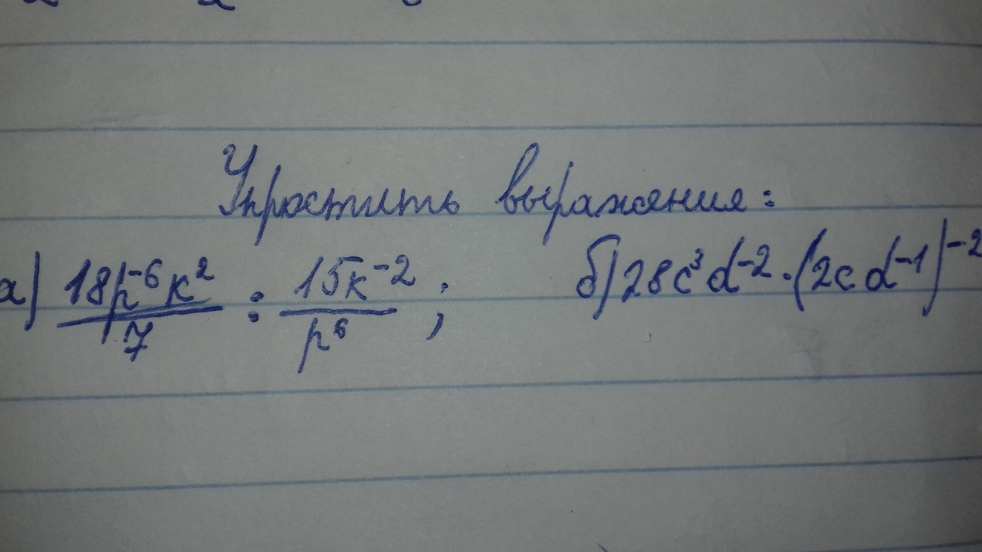 \frac{18p^{-6}k^2}{7} = \frac{18k^2}{7p^6}\\\\28c^3d^{-2}(2cd^{-1})^{-2} = 28c^3d^{-2}*2^{-2}c^{-2}d^{2} = 28c^3d^{-2}* \frac{1}{2^2}c^{-2} d^2 = 28c^3d^{-2}* \frac{1}{4}c^{-2} d^2 = 7c^3d^{-2}c^{-2}d^2 = 7c