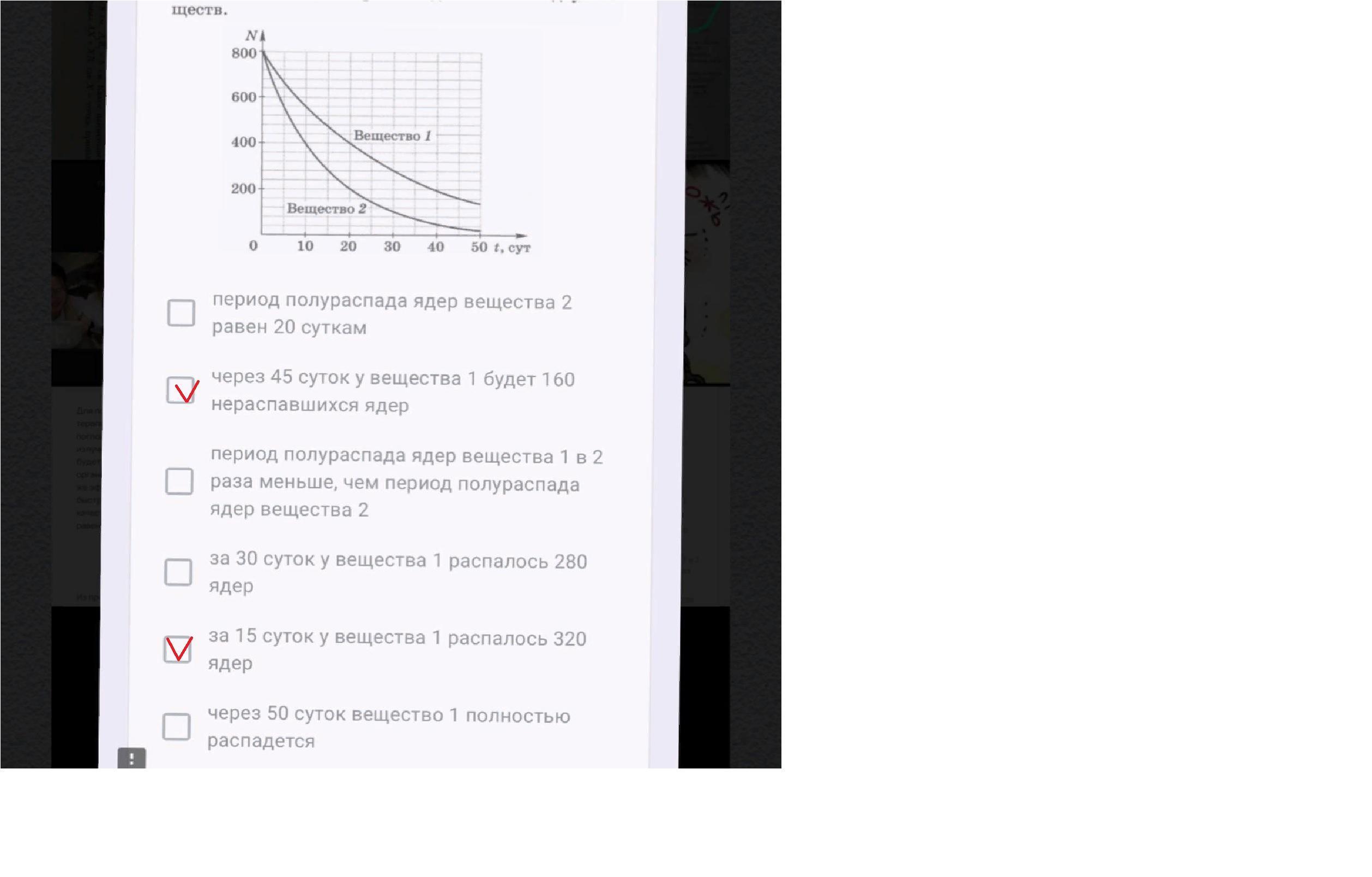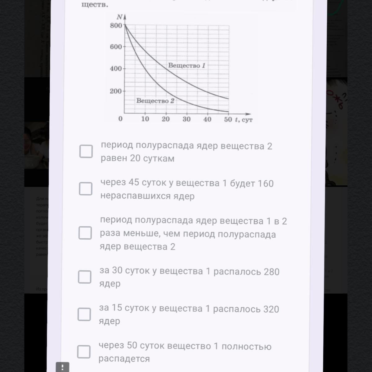 Из предложенного перечня утверждений выберите правильные. На рисунке даны графики зависимости числа радиоактивных атомов от времени для изотопов двух веществ. Пожалуйста, отдаю все свои баллы!