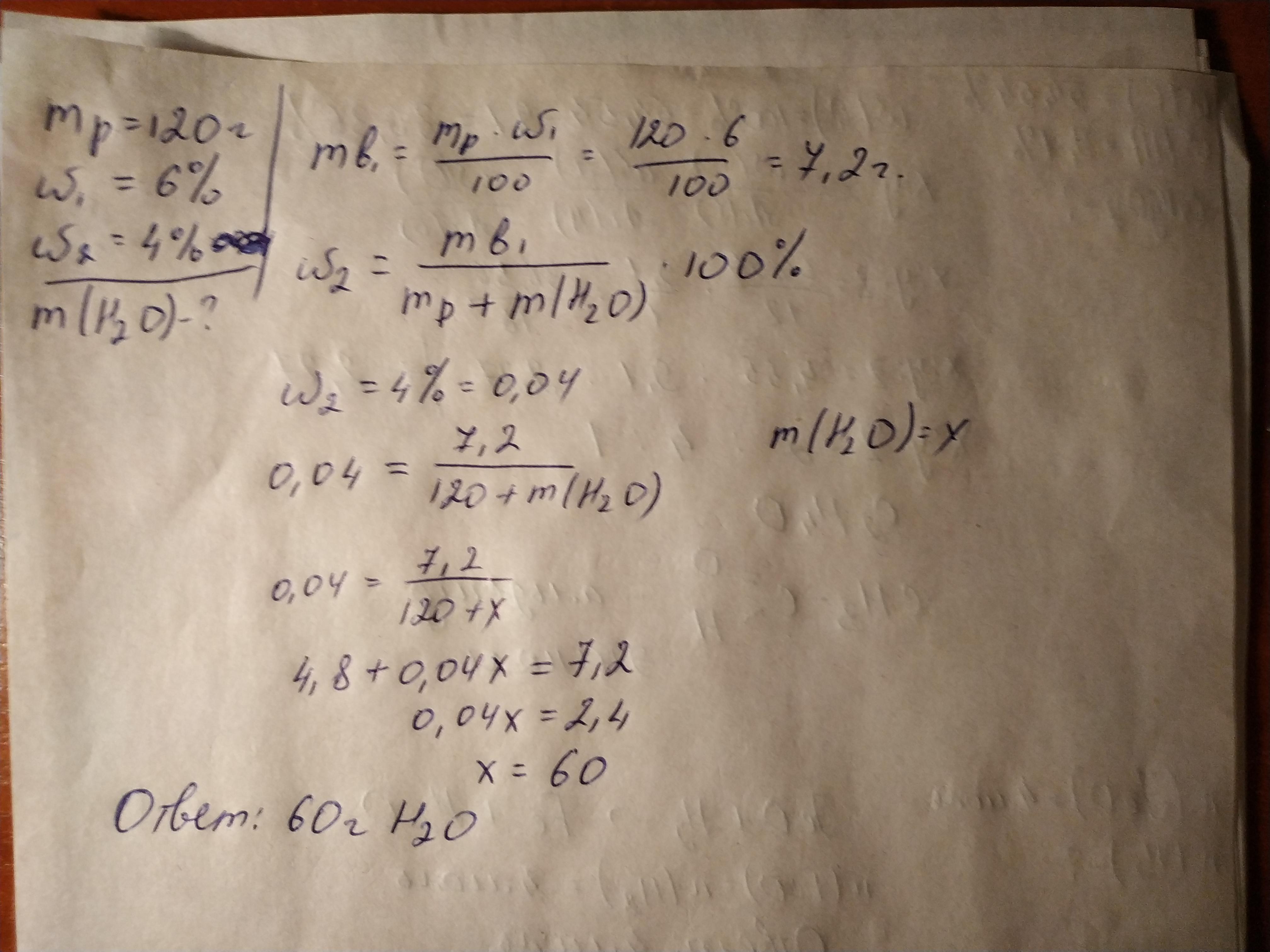 ПОМОГИТЕ ПОЖАЛУЙСТА СРОЧНО ДАЮ 56 БАЛОВ УМОЛЯЮ ПОДАЛУЙСТА Є 120г розчину з масовою часткою солі 6%. Скільки води потрібно додати, щоб отримати розчин з масовою часткою солі 4%?