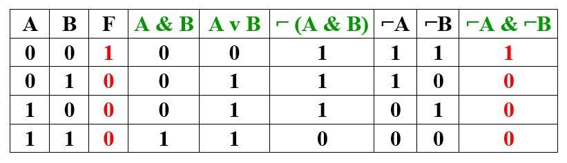 1) A & B 2) A v B 3) ⌐(A & B) 4) ⌐A & ⌐B