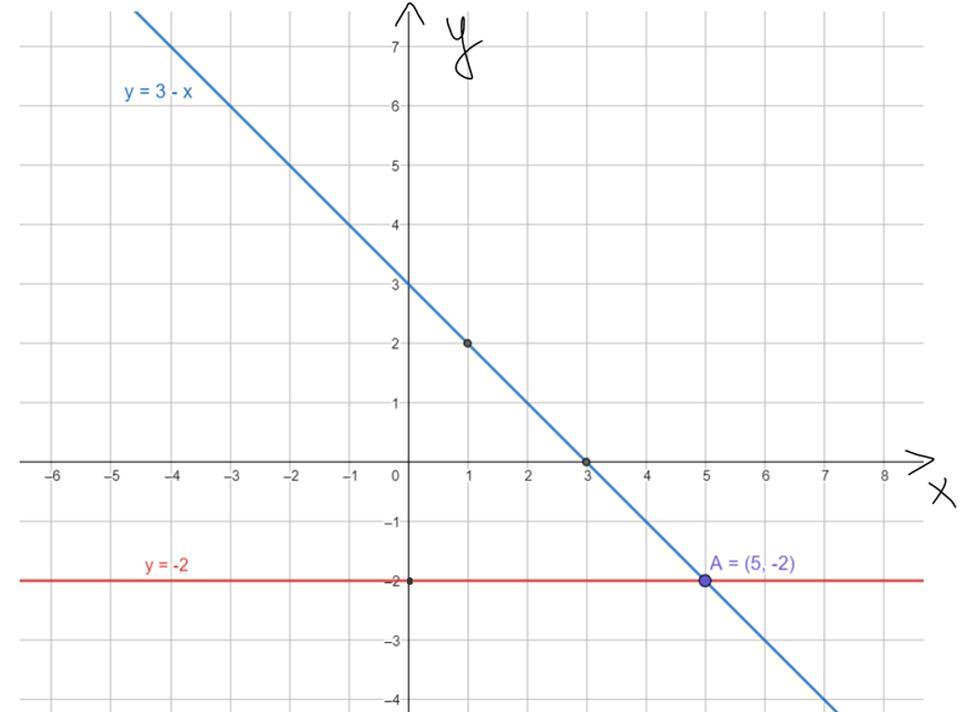 побудуйте в одній системі координат графіки функцій y=3-x і y=-2 і знайдіть координати точки їх перетину.