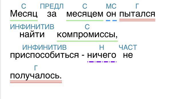 Синтаксический разбор предложения: Месяц за месяцем он пытался найти компромиссы, приспособиться - ничего не получалось.