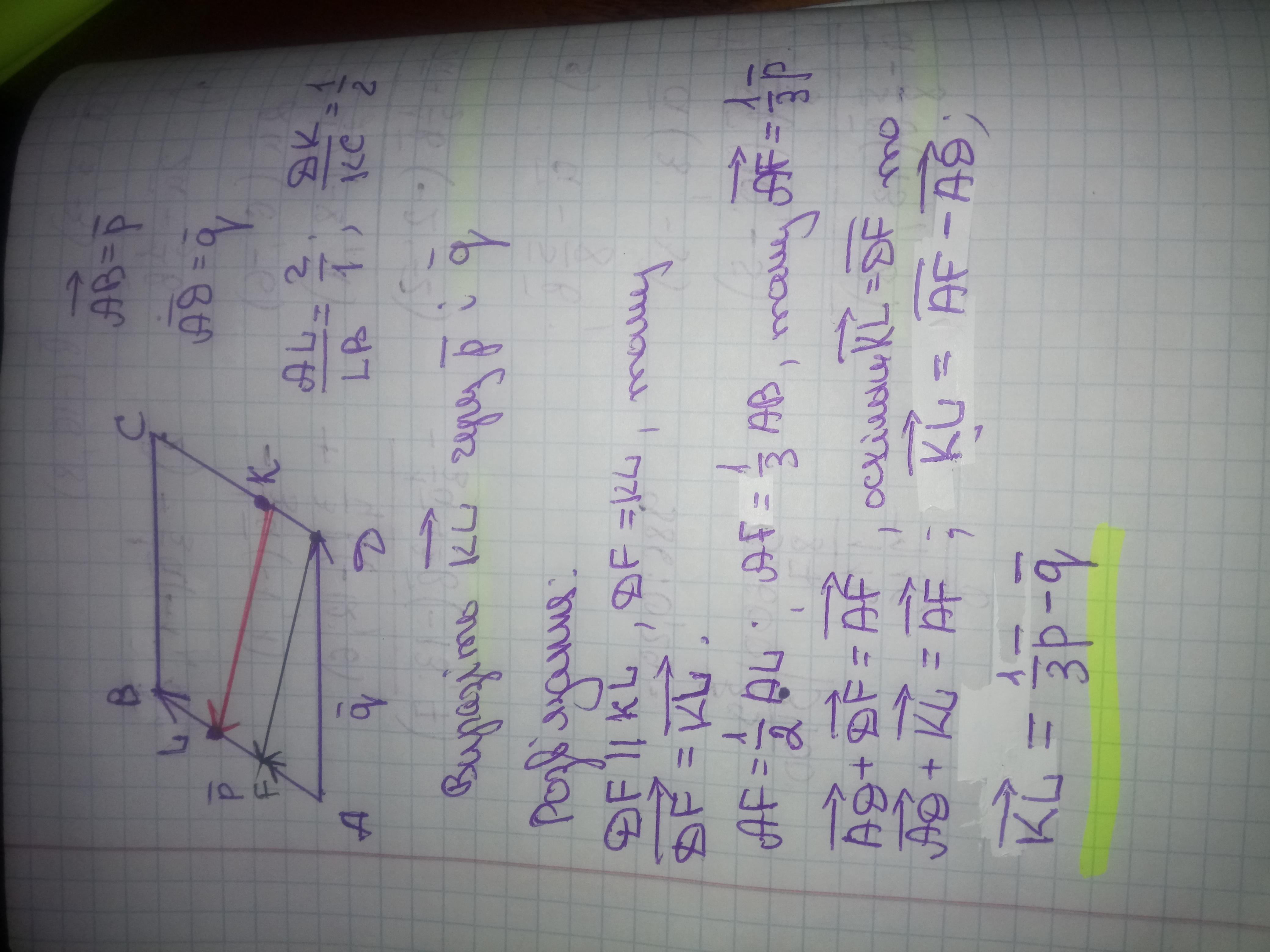 Дано паралелограм ABCD AB = p̄, AD = q̄ точка L ділить сторону AB у відношенні 2:1, а точка К – сторону DC у відношенні 1:2. Виразіть вектор K̅L̅ через вектори p̅̅ і q̅.