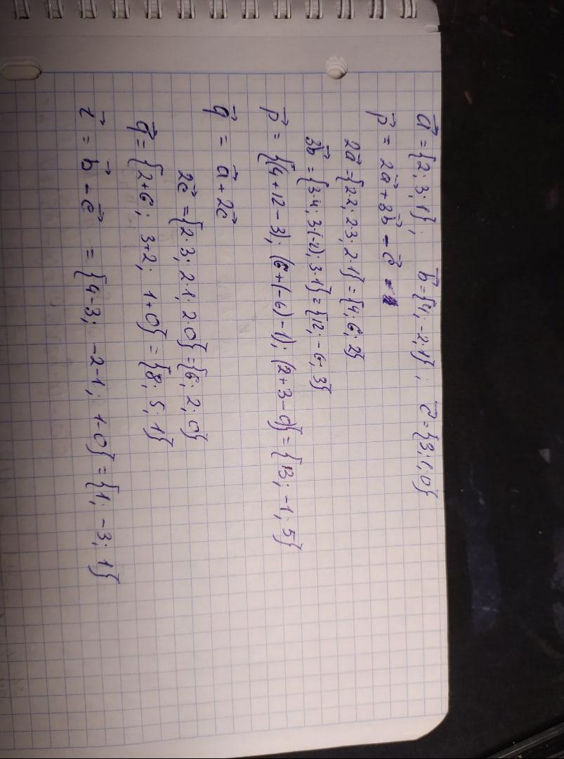 Найти: p ⃗=2а ⃗+3b ⃗-c ⃗, q ⃗=а ⃗+2c ⃗, t ⃗=b ⃗-c ⃗