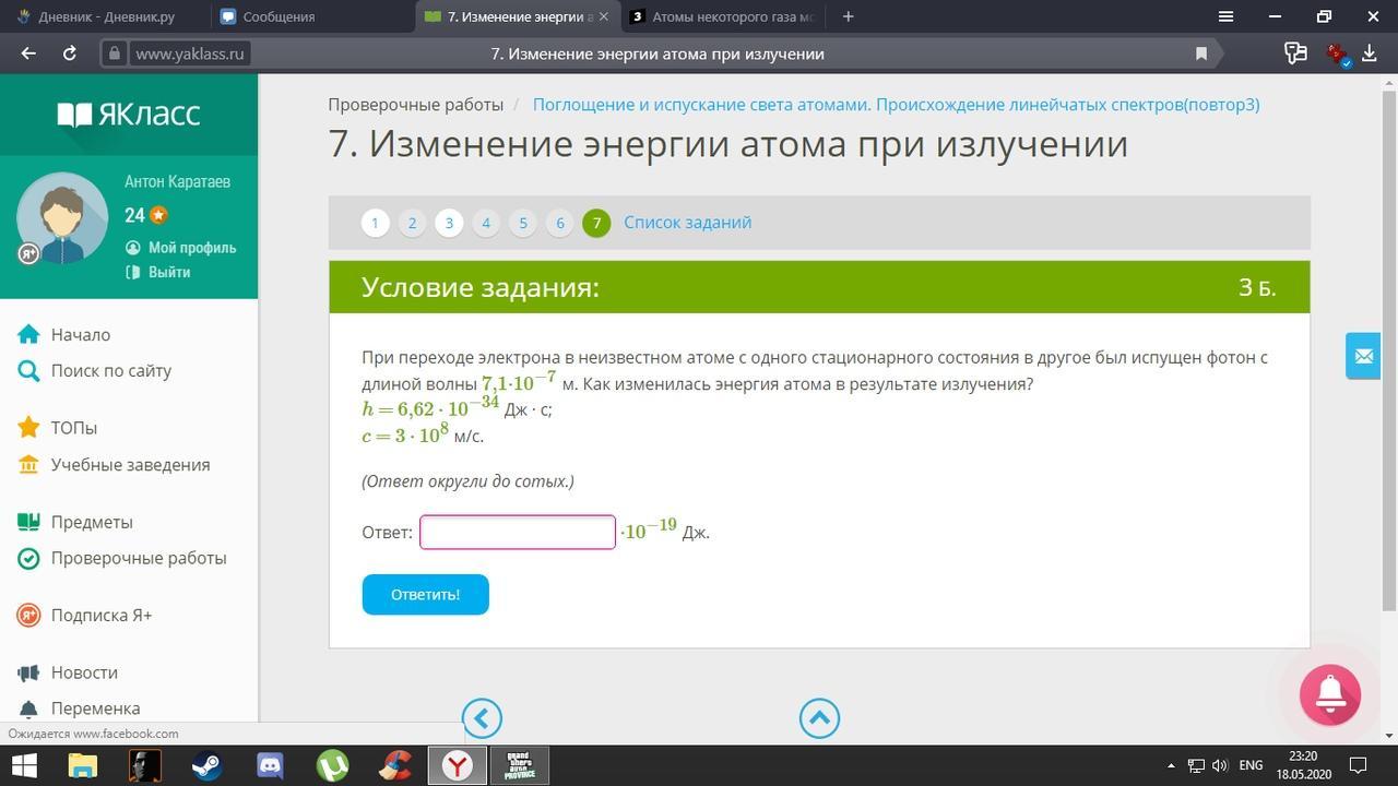 При переходе электрона в неизвестном атоме с одного стационарного состояния в другое был испущен фотон с длиной волны 7,1⋅10−7 м. Как изменилась энергия атома в результате излучения?