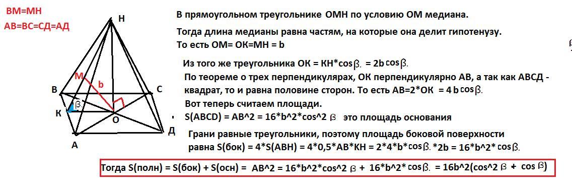 В правильной четырехугольной пирамиде высота образует с боковой гранью угол β.