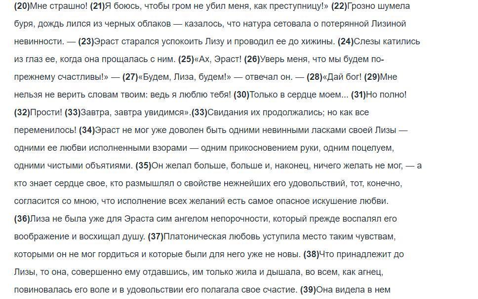 1)Она бросилась в его объятия — и в сейчас надлежало погибнуть непорочности! — (2)Эраст чувствовал необыкновенное волнение в крови своей — никогда Лиза не казалась ему столь прелестною — никогда ласки ее не трогали его так сильно — никогда ее поцелуи не были столь пламенны — она ничего не знала, ничего не подозревала, ничего побоялась — мрак вечера