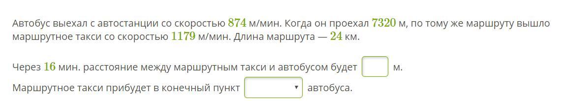Автобус выехал с автостанции со скоростью 874 м/мин. Когда он проехал 7320 м, по тому же маршруту вышло маршрутное такси со скоростью 1179 м/мин. Длина маршрута — 24 км.