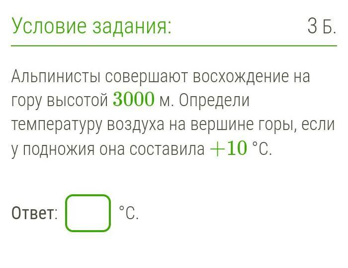 Альпинисты совершают восхождение на гору высотой 3000 м. Определи температуру воздуха на вершине горы, если у подножия она составила +10 °С.