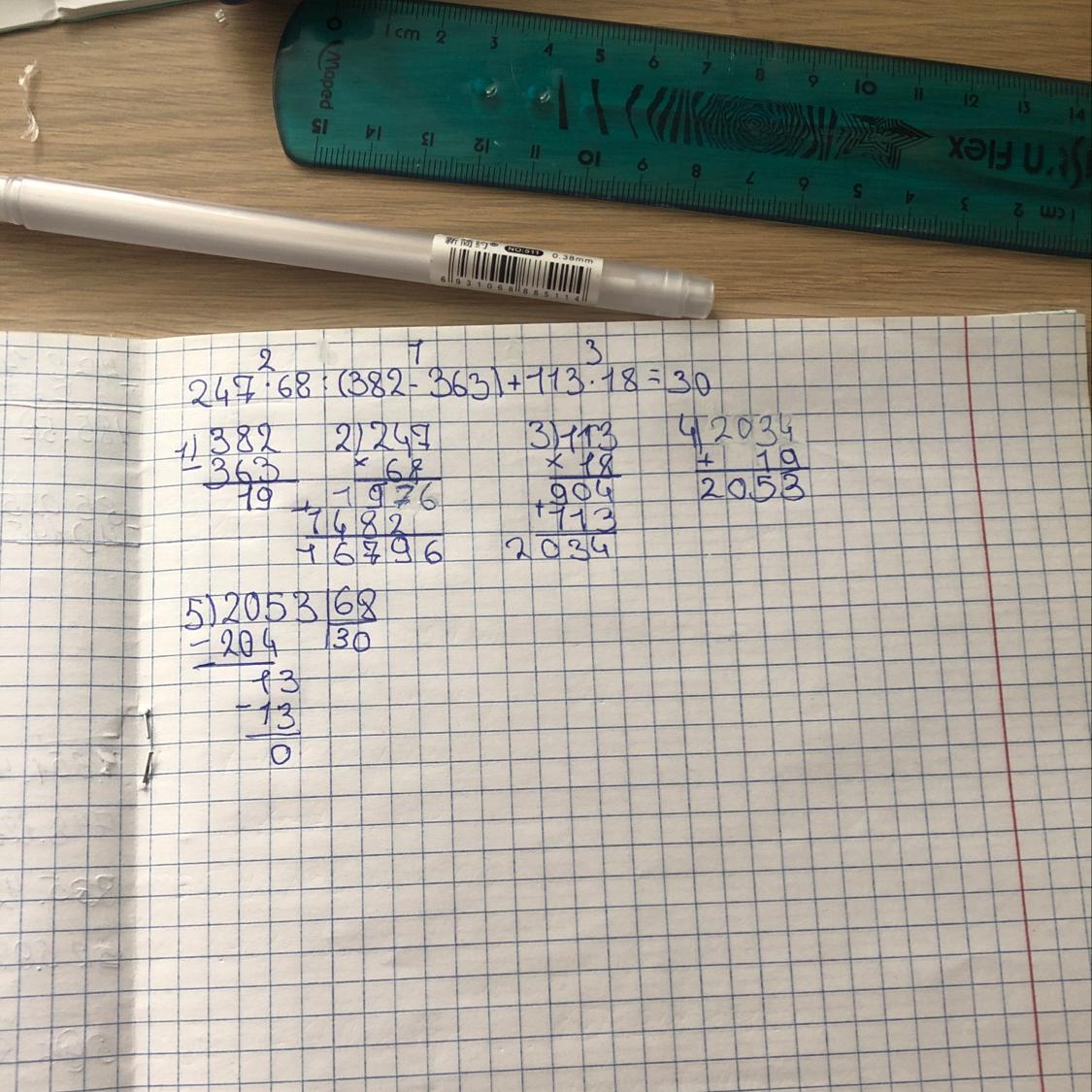 247 • 68 : ( 382 — 363 ) + 113 • 18
