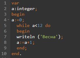 «3»: Вывести на экран в столбик 12 раз слово «Весна».