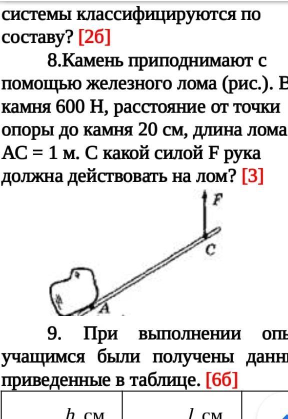 Камень приподнимают с помощью железного лома (рис.). Вес камня 600 Н, расстояние от точки опоры до камня 20 см, длина лома АС = 1 м. С какой силой F рука должна действовать на лом? [3]