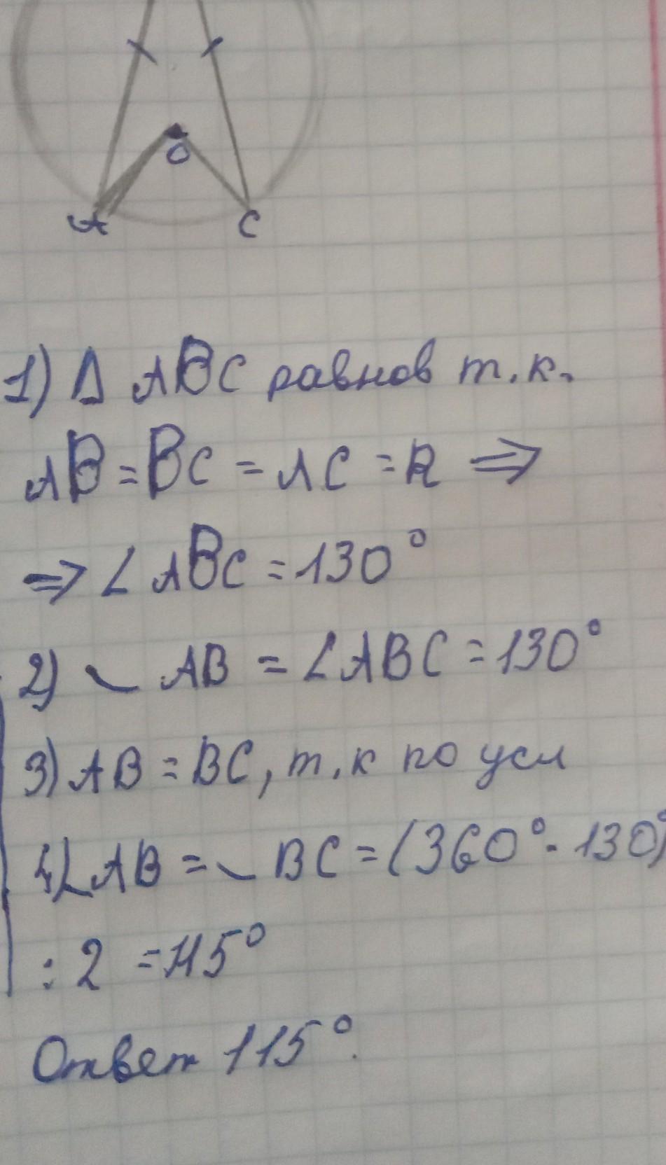 Равнобедренный треугольник АВС вписан в окружность. Дуга АВ =130 градусов. Найдите угол АОС.